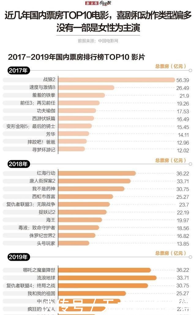 纵观近几年来国内影视市场,从2017-2019年的票房TOP10影片,没有一部是以女性为主演的。